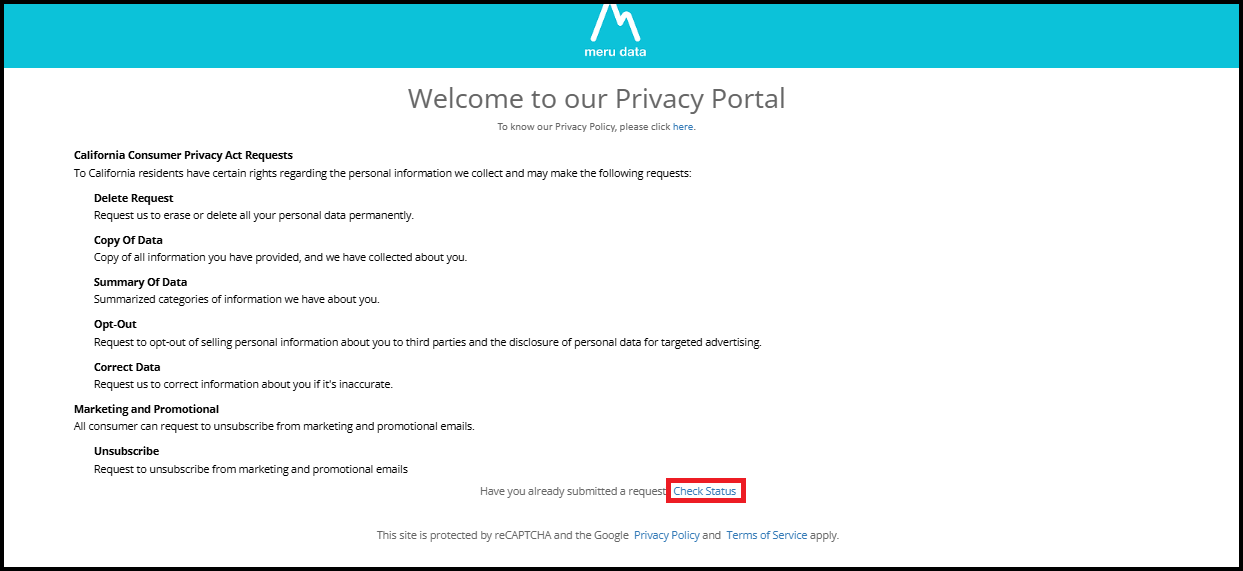 1. Clicking Check Status will navigate you to the Privacy Portal Login page, where you can log in, to view the status of your submitted request.