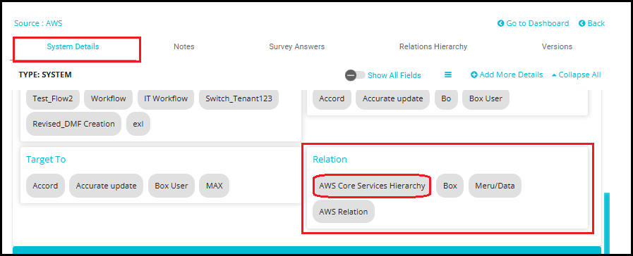 - In the Systems tab, locate and click on the system name (e.g., AWS) that was used as the Parent in your relation.