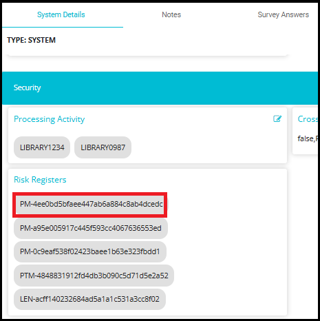 Users can add Risks to survey answers whenever applicable. These risks along with their details such as the name of the System it is applicable to, the severity of the risk and so forth are added to an overall risk register.