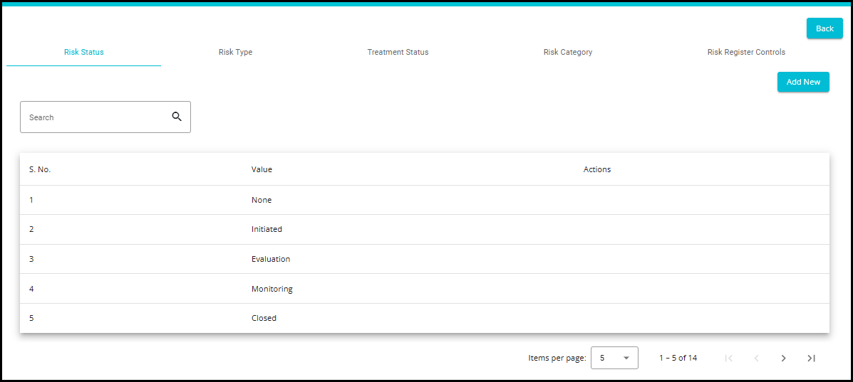 - You will be navigated to the configuration page, where you can add custom values to risk attributes such as: Risk Status, Risk Type, Treatment Status, Risk Category, and Risk Register Controls.