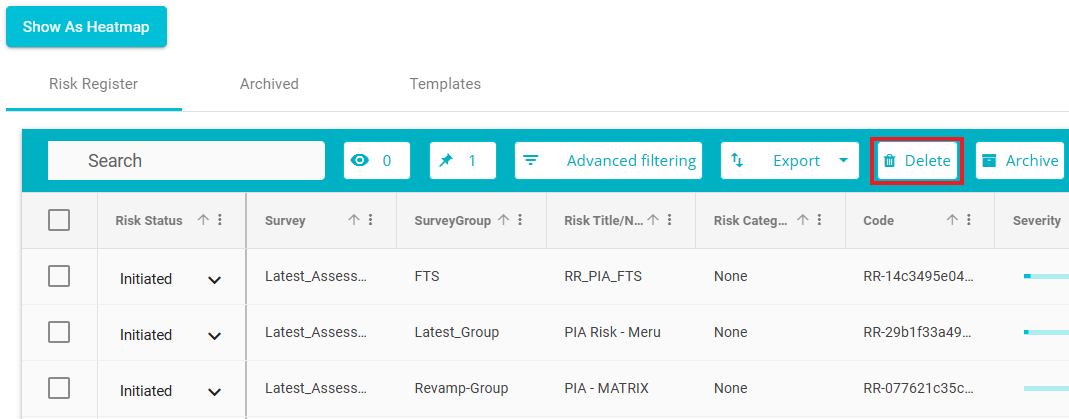 - User also can perform bulk delete by selecting the required Risks and clicking on archive button.