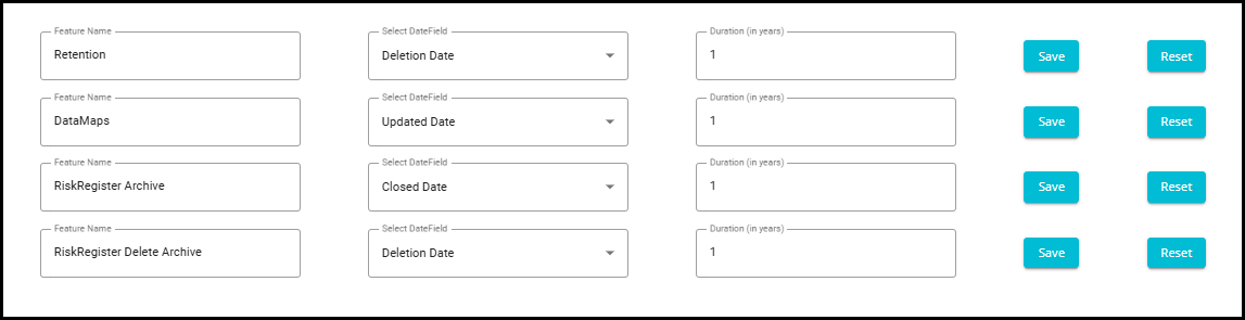 - Risk Register Delete Archive: Here you can configure when the risks present on the Archived table will be permanently deleted. The delete config duration will be counted from the Deletion Date. The Deletion Date is the date on which the risk was moved to the Archived table.