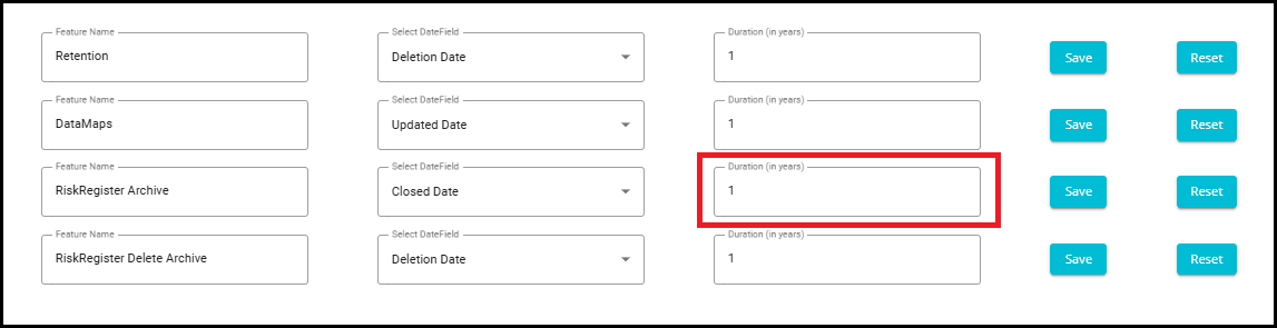 For example, If the number you typed in the Duration field is 1, then the risks on the Archived table will be permanently deleted after 1 year from the date on which it was moved to the Archive table.