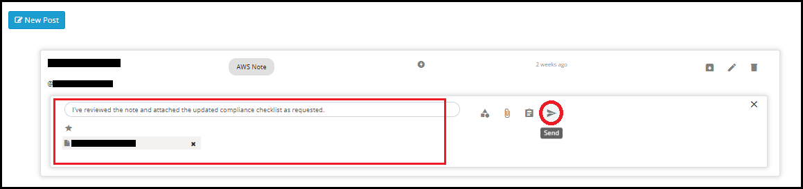 - Once the task has been configured, click Save or click on Send icon to post the Note.