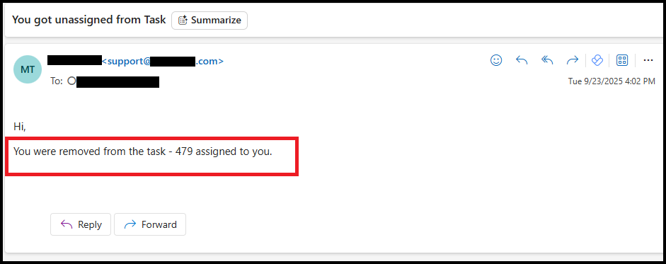 - After reassignment: The previous assignee receives an email stating: "You were removed from the task."