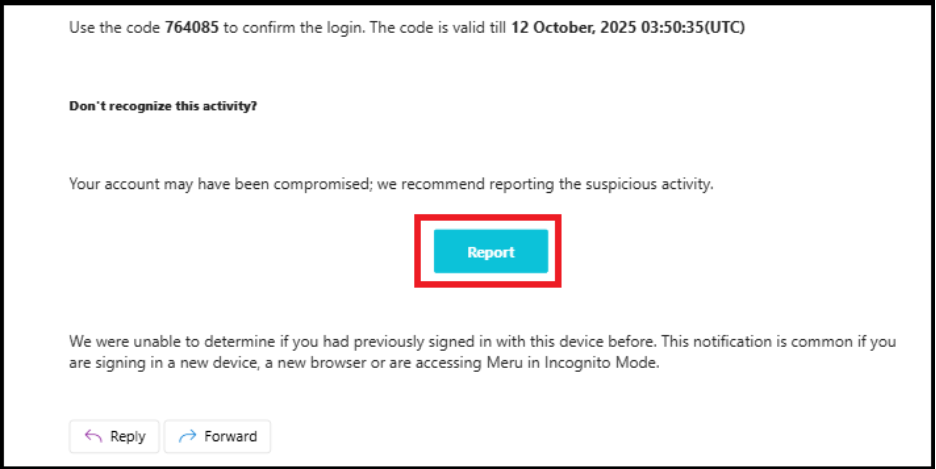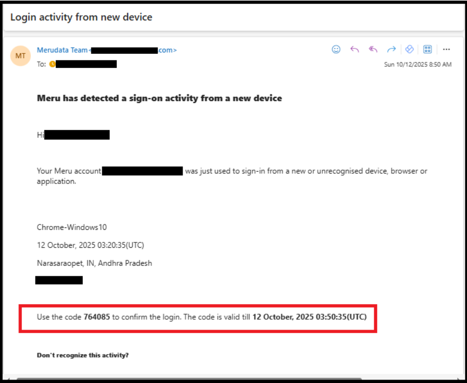 - The email will also contain a one-time verification code to confirm the login.